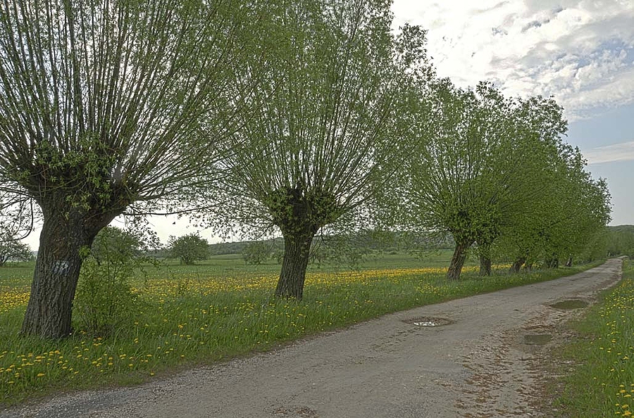 Opis: Typowy ponidziański krajobraz, wierzby, mlecze sielsko i anielsko.
