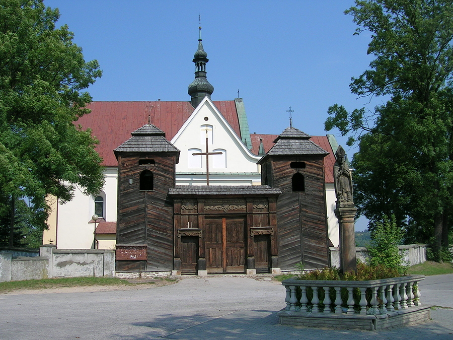 Opis: Brama wejściowa na plac przykościelny wmontowana jest w dwie drewniane wieże - dzwonnice. Ze względu na swój unikalny kształt, zaliczana jest do najważniejszych zabytków tego typu w Polsce być może jedynym w swoim wyglądzie. Ciesielka jest oryginalna, a niektóre elementy pochodzą z pierwotnego, XIV -wiecznego kościoła. Bramę ozdabiają rzeźbione w drewnie ornamenty. Nad drzwiami umieszczono napis AN.DO 1779. Przed bramą figura św. Stanisława Biskupa , z tyłu kościół p.w WNMP.