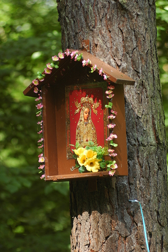 Opis: "Naród się zepsuł. Gdy się nie nawróci, wkrótce przyjdzie ciężka wojna, od której wielu ucierpi. Przyjdzie zaraźliwa choroba, podczas której wielu ucierpi i umrze. Mikołaju, proszę cię, abyś się udał do sosny, na której wisi święty wizerunek, i zrób tam porządek, bo cały naród tu przyjdzie i moc łaski czerpać będzie." (Z orędzia Bolesnej Królowej Polski, które zostało wypowiedziane w lasku grąblińskim do pasterza Mikołaja Sikatki)