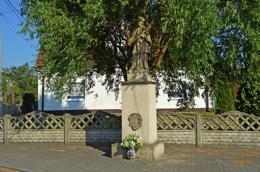 Opis: Kamienny posąg z 1746 r. we wsi przy drodze - figura św. Jana Nepomucena na czworobocznym postumencie z kartuszem herbowym rodu von Strachwitz.