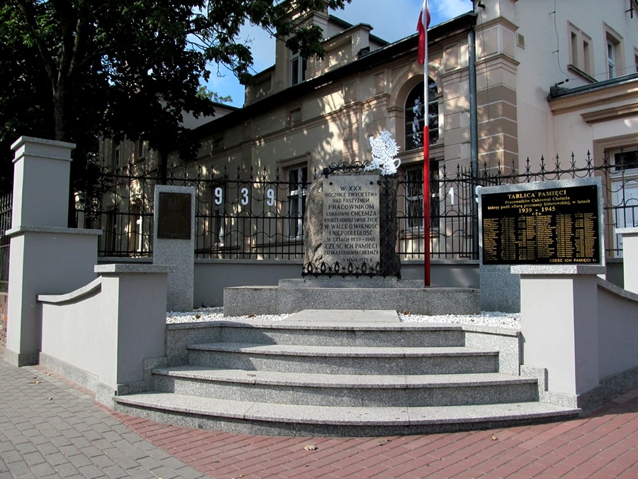 Opis: W latach II wojny światowej, 45 pracowników (mężczyzn) chełmżyńskiej cukrowni, zginęło z rąk hitlerowskiego okupanta. Dziś każdy może oddać im pokłon, bowiem po lewej stronie przed wejściem głównym do zakładu, stworzono miejsce pamięci, gdzie ustawiono m.in. tablicę z wykazem osób zamordowanych w latach 1939 1945; przy każdym nazwisku jest data urodzenia i rodzaj stanowiska, na jakim pracował w cukrowni oraz data i miejsce śmierci. Druga tablica (już bez listy nazwisk), poświęcona jest pamięci tych pracowników cukrowni, którzy zostali wywiezieni w głąb Rosji w lutym 1945 r. przez władze stalinowskie; wówczas deportowano także innych mieszkańców tego niewielkiego miasta i okolic. Im to, w lutym 2005 r., a więc w 60 rocznicę deportacji, mieszkańcy Chełmży postawili pamiątkowy kamień, który usytuowano na niewielkiej wysepce na rozwidleniu ulic: Bydgoskiej i Wyszyńskiego. Z ponad 600 wywiezionych na Sybir osób, tylko nieliczni wrócili do kraju. Pamiątkową tablicę poświęconą mieszkańcom deportowanym do ZSRR przez Urząd Bezpieczeństwa Publicznego (UBP) i siły NKWD, zafundował Komitet Obywatelski, a zawisła na budynku Komendy Policji.