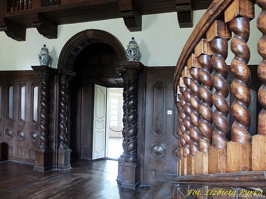 Opis: Schody na pietro maja balustradę z czarnego dębu, moczonego przez 5 lat w Bugu