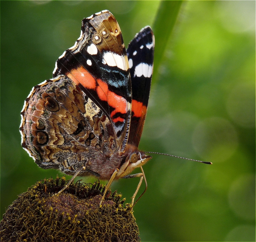 Opis: Rusałka admirał ( Vanessa atalanta) - przedstawiciel rodziny rusałkowatych o rozpiętości skrzydeł od 50 do 60mm. Dorosła forma motyla występuje przez cały rok. Motyla można najczęściej zaobserwować w sadach na opadniętych owocach. Gatunek zimuje w stadium motyla, ale w naszym zimnym klimacie rzadko przeżywa zimę. Co roku przylatują do nas nowe motyle z południa Europy i Północnej Afryki.