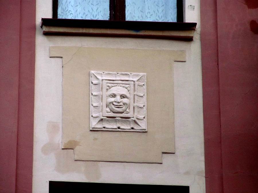 Opis: Plafon to dekoracyjna kompozycja zdobiąca w obramowaniu. Na elewacji kamienicy z XIII wieku i wielokrotnie przebudowywanej w kolejnych wiekach, stojącej w Toruniu przy ul. Chełmińskiej 12, między oknami I i II piętra jest kilka tego rodzaju ozdób, ale każda przedstawia inny obraz.