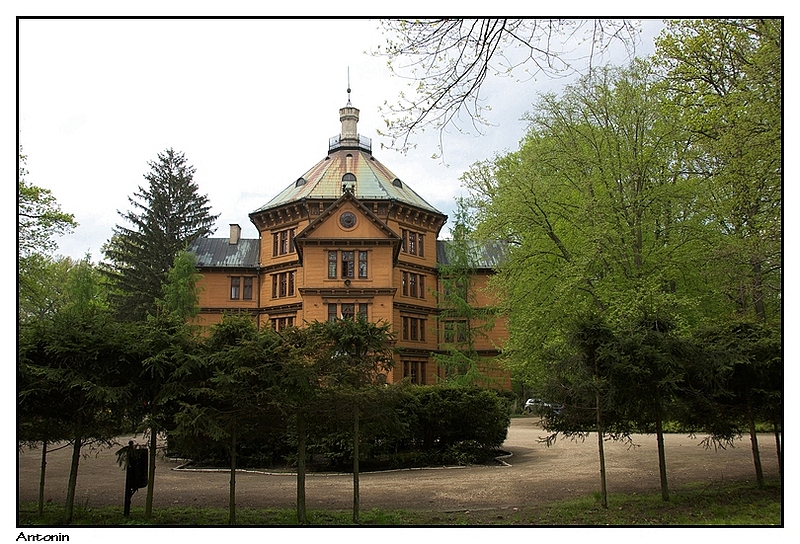 Opis: Pałac w Antoninie zbudowany został w latach 1822 - 1824 przez Karla Fryderyka Schinkla dla księcia Antoniego Radziwiłła. Jest to budowla o konstrukcji drewnianej, oszalowana i usadowiona na podmurówce. Pałac zbudowano na planie krzyża greckiego, co jest rzadkością wśród tego typu rezydencji. Całe wnętrze korpusu głównego zajmuje sporych rozmiarów, trójkondygnacyjna sala o ozdobnym stropie wspartym na grubej kolumnie - kominie. Częstym gościem Antonina był Fryderyk Chopin. Na elewacji pałacu znajduje się tablica upamiętniająca te wizyty, a przy wejściu na teren pałacowy umiejscowiony jest pomnik kompozytora.