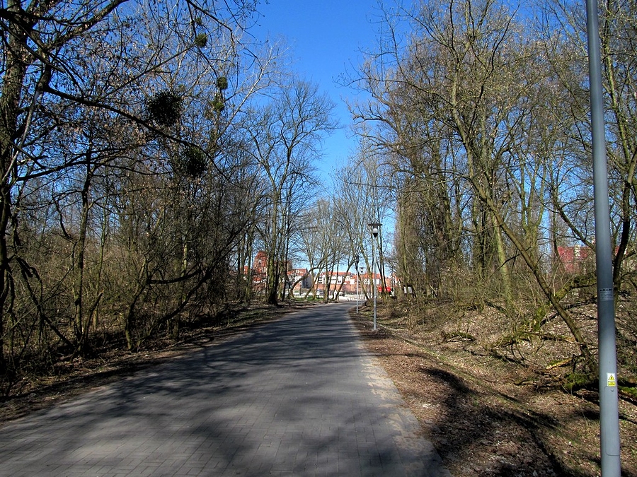 Opis: Drzewa i krzewy na Kępie Bazarowej w Toruniu jeszcze są w zimowym letargu, ale niebawem już przyroda obudzi się do życia. Na zdjęciu: Asfaltowa aleja na Kępie Bazarowej prowadzi na taras widokowy, z którego można podziwiać piękną panoramę miasta z jej starówką wpisaną na listę dziedzictwa narodowego UNESCO.