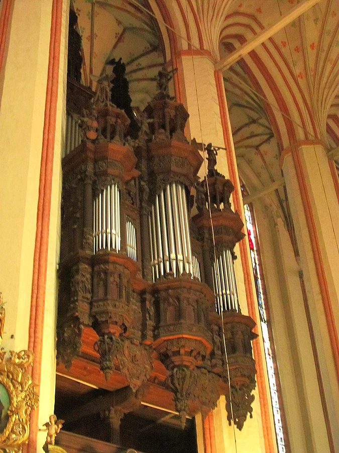 Opis: Kościół pw. Wniebowzięcia Najświętszej Marii Panny w Toruniu powstał w latach 1557 1724, natomiast organy, jakie tutaj zostały zainstalowane (na zdjęciu), zbudowane zostały w 1609 roku przez Hansa Hewigkena z Neustadt. Pierwotnie posiadały tylko 32 registry na dwóch manuałach, ale w latach 1924 - 1925 zostały całkowicie przebudowane przez Dominika Biernackiego z Włocławka. Wtedy też dodany został trzeci manuał oraz nowy stół gry. Dzięki tym zmianom instrument uzyskał nowe romantyczne brzmienie. W 1976 roku Witold Przytulski organomistrz z Gdańska, wprowadził modernizacje techniczne; z elementów historycznych zachowała się praktycznie jedynie renesansowa snycerka prospektu.