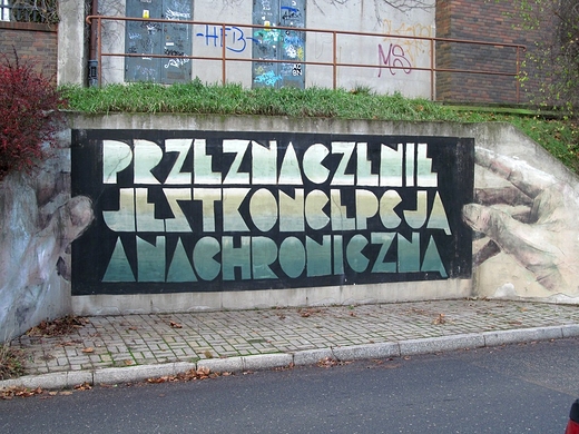 Opis: Street-art to już niemal codzienność w Toruniu i nikogo nie dziwią nawet bazgroły, chociaż na pewno takie bardzo irytują i denerwują. Ale są i takie dzieła, na które chętnie się spojrzy, a nawet z uwagą i zaciekawieniem dokładnie przyjrzy i zastanowi, jak chociażby patrząc na ten mural (na zdjęciu), prezentujący hasło \"Przeznaczenie jest koncepcją anachroniczną\", umieszczony na ściance zatoczki przy ul. Wola Zamkowa, znajdującej się na tyłach Baju Pomorskiego.