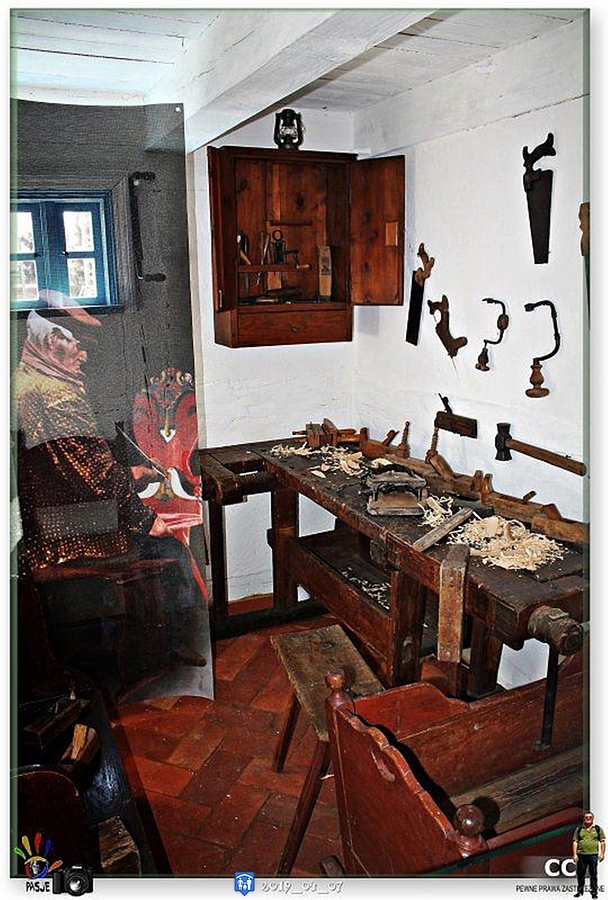 Opis: \"Zagroda Jamneńska\"...warsztat stolarza-wśród różnych dziedzin kultury jamneńskiej szczególnie rozwinięty był kunszt stolarski. W XIX wieku Jamno było znaczącym ośrodkiem wyrobu mebli, a miejscowi stolarze przyjmowali zamówienia nie tylko od miejscowych ale również od okolicznych wsi i z miasta Koszalina.